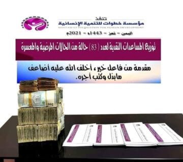 توزيع المساعدات النقدية (زكاة)Khotwat Orgديسمبر 15, 2021وزعت مؤسسة خطوات للتنمية الإنسانية (1,660,000)مبلغ المساعدات النقدية المقدمة من فاعل خير، لعدد (83) حالة من الحالات المرضية والمعسرة بواقع ... اقرأ أكثر